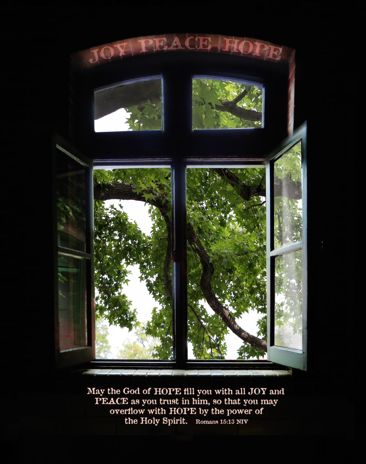 The window is a few layers. Original window had people behind it. Reflection of tree on right window pane was added as well as tree added. Reminds me of a fresh new morning. May you have joy, peace and hope!